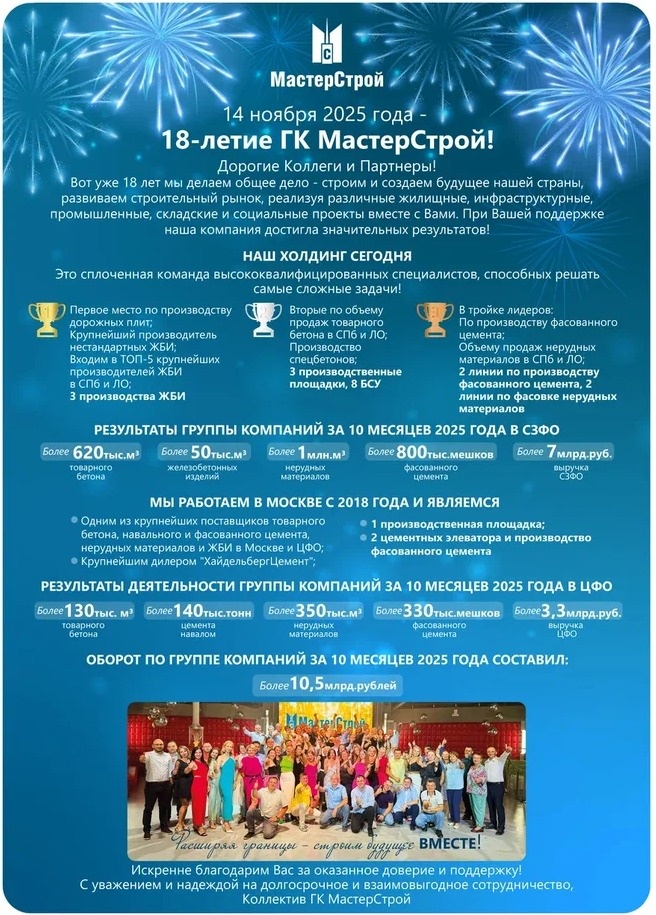 Дорогие коллеги и партнеры! Вот уже 18 лет мы делаем общее дело – строим и создаем будущее нашей страны, развиваем строительный рынок, реализуя различные жилищные, инфраструктурные, промышленные, складские и социальные проекты вместе с Вами. При Вашей поддержке наша компания достигла значительных результатов! Искренне благодарим Вас за оказанное доверие и поддержку! С уважением и надеждой на долгосрочное