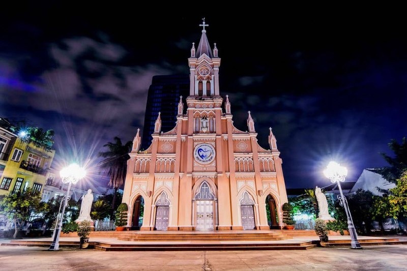 Кафедральный собор — единственный католический храм в Дананге. Монументальное здание выполнено в неоготическом стиле. Ступенчатый фасад на каждом уровне завершается изящными башенками. Между полуколоннами тянутся белоснежные лепные фризы, придающие храму воздушный вид. Цоколь оформлен стрельчатой аркадой, а верхний ярус венчает башня под конусовидным шпилем. Фасад выкрашен в нежно-розовый цвет, отчего в народе святыню прозвали «Розовой церковью». С обеих сторон от здания установлены мраморные статуи святых. Посетители не упускают возможность прогуляться на площади перед храмом. Это одно из самых популярных мест для отдыха на свежем воздухе. Проще говоря. Дананг