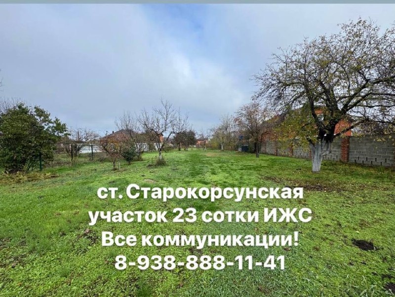 Продаю земельный участок 23,5 сотки с жилым домом 66 кв.м. Фасад 20 м. Участок находится в зоне Ж-1 (в зоне застройки индивидуальными жилыми домами) по адресу: ст. Старокорсунская Все коммуникации проведены: городское водоснабжение – 2 точки, колодец для технических нужд и полива, 2 точки электроснабжения на 15 квт и 3 квт, газовая труба проходит ровно по границе, канализация – септик. На участке большой сад с плодоносящими деревьями. Планировка участка позволяет разместить порядка 2х новых домов и вспомогательные строения (зону барбекю, «пацху», детскую площадку или бассейн). К удачному расположению участка необходимо отнести близость социальных объектов, магазинов первой необходимости («Магнит», «Пятерочка»), а также автобусную остановку. Важный момент – транспортная доступность, благодаря реконструкции федеральной трассы средней загруженности, так, до ТЦ Oz Mall – 15 минут, до центра города – 35-40 минут. Место тихое, уютное, из-за удаленности от федеральной трассы и промышленных об