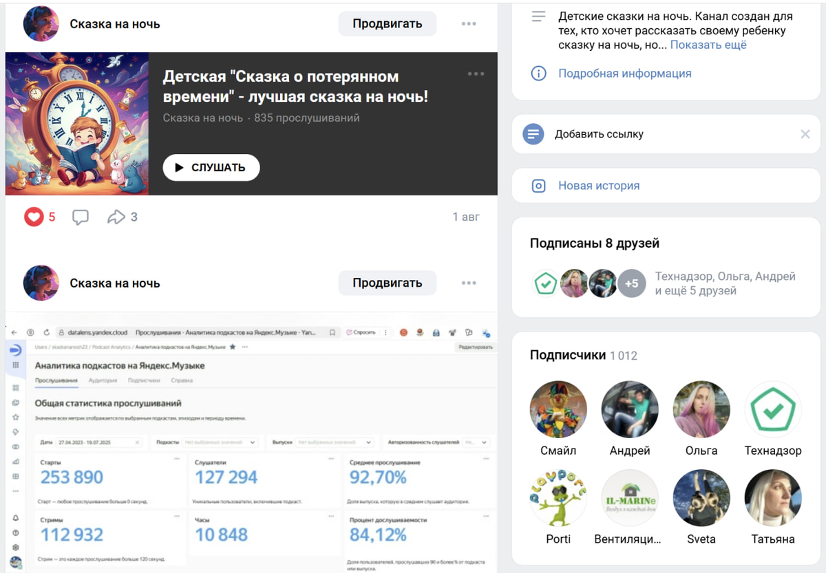 Друзья, у нас радостная новость! Вернее несколько радостных новостей! 1. Наша группа в ВК уверенно растет и уже перешагнула отметку в 1000 подписчиков! А, если быть точными, то их – 1012! Вот ссылочка на группу: https://vk.com/skazkananosh Не забудьте подписаться! 2. Вторая новость еще более прекрасна! Согласно одного сервисов статистики, наш подкаст в Яндекс Музыке собрал более 345 тысяч прослушиваний. И это, не считая других популярных подкаст сервисов, в которых размещен наш подкаст «Сказка на ночь»! Ссылка на наш подкаст в Яндекс Музыке: https://music.yandex.ru/album/27546952 Не забудьте подписаться!