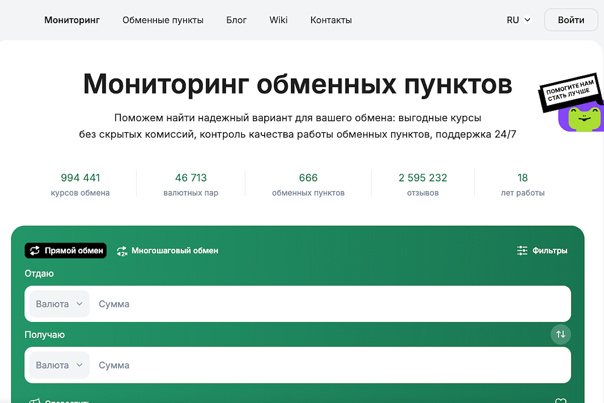 фирменный маскот — лягушка, внедрённая в интерфейс и коммуникации бренда. Ключевое внимание уделено основному инструменту сервиса — мониторингу обменников. Карточки предложений обмена стали нагляднее, появилась новая система визуаль