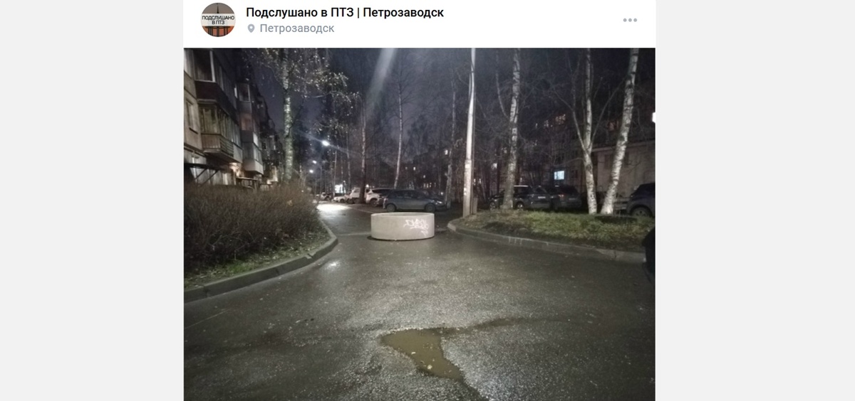 В карельской столице проезды во дворах блокируют бетонными преградами. В паблике «Подслушано в Птз» на днях жаловались, что проезд между домами № 7 и № 11 по улице Северной стал похож на трассу. Горожане говорят, машины едут, не сбавляя скорости, из подъезда не выйти. Одни перегораживали проезд, накидывая палки и камни, а другие все это раскидывали. Теперь же там кто-то установил бетонный блок – его так просто не сдвинуть. Еще один проезд во дворе перекрыли на Московской – посреди асфальта теперь лежит бетонное кольцо. Горожане в соцсети интересуются, насколько это законно. «Из-за чего и законно ли перекрыли проезд по улице Московская, 15? Положили бетонное кольцо и поставили знак тупик».
