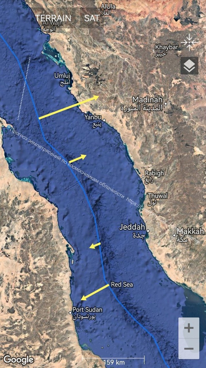 Из необычного этой ночью можно отметить дегазацию в Красном море между Суданом и Мединой. Протяженности ОСТИ хватает на событие с магнитудой до М6.2 ===== One of the unusual things about this night is the degassing in the Red Sea between Sudan and Medina. The length of the CSTI is enough for an event with a magnitude up to M6.2
