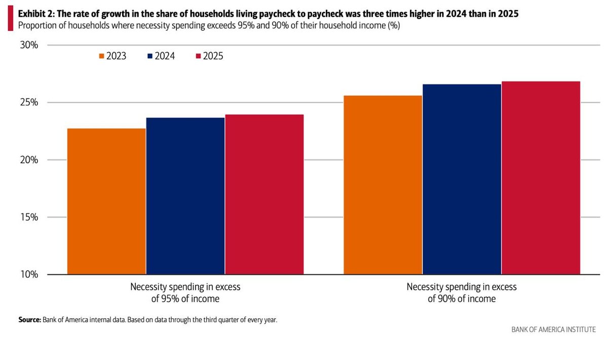 В 2025 году почти четверть американцев живут от зарплаты до зарплаты, пишет Bank of America Institute Число домохозяйств с низким доходом (особенно миллениалов и поколения X), живущих от зарплаты до зарплаты, продолжает расти, в то время как число домохозяйств с высоким и средним доходом не увеличивается. При этом отмечают, что темпы роста доли домохозяйств, живущих от зарплаты до зарплаты, в 2024 году были в три раза выше, чем в 2025 году В понятие "от зарплаты до зарплаты" включают расходы на жилье, бензин, продукты питания, коммунальные платежи, доступ в интернет, общественный транспорт и уход за детьми. На остальное денег не хватает.