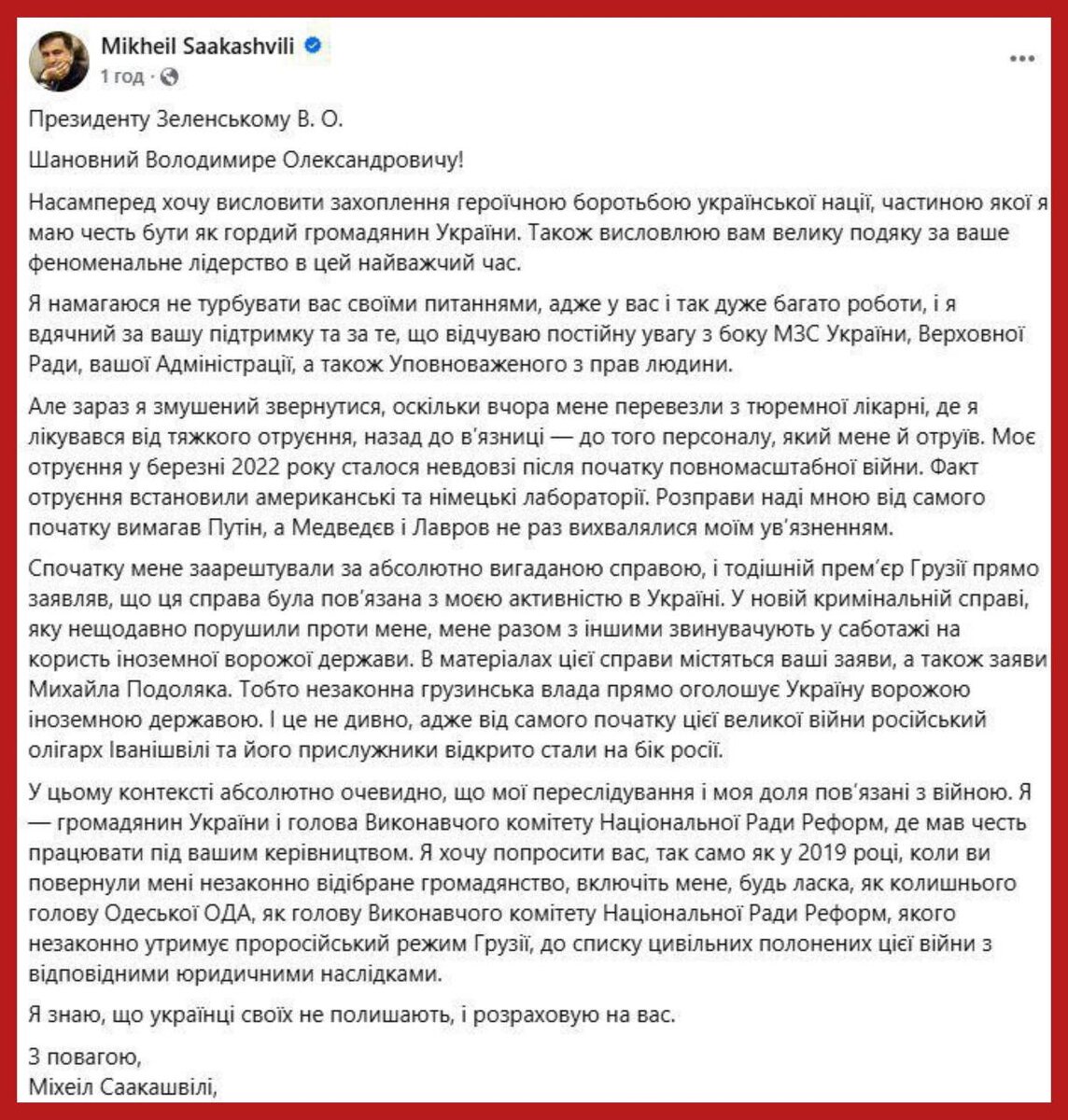 Саакашвили просит Зеленского внести его в список гражданских пленных. "Я прошу вас, как и в 2019 году, когда вы вернули мне незаконно отобранное гражданство, включить меня — как бывшего главу Одесской ОГА и руководителя Исполнительного комитета Национального совета реформ, которого незаконно удерживает пророссийский режим Грузии — в список гражданских пленных этой войны с соответствующими юридическими последствиями". Он отмечает, что вчера его перевезли из тюремной больницы снова в тюрьму — к персоналу, "отравившему его". Подпишись на Телеграм Александр Семченко