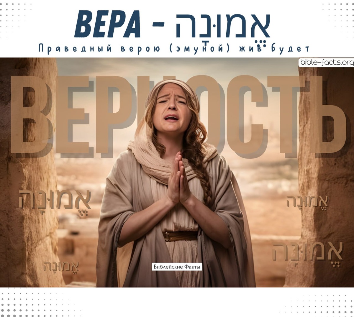 На древнееврейском языке слово «вера» звучит как אֱמוּנָה (эмуна). Эмуна (אֱמוּנָה) происходит от корня אָמַן (аман), который означает быть твёрдым, надёжным, верным. «Вера» – понятие очень близкое к понятию «верность, преданность». То есть в библейском понимании вера — это не просто убеждение, а доверие и верность, устойчивость, надёжность в отношении к Богу. Поэтому, когда в Писании говорится: «Праведный верою (эмуной) жив будет» (Аввакум 2:4), имеется в виду не только “верить”, но и оставаться верным, “стоять твёрдо” в доверии к Богу.