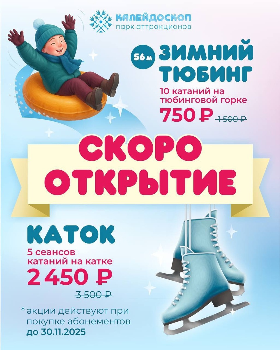 Зимняя сказка приближается ❄️ Совсем скоро в парке «Калейдоскоп» откроются два главных центра притяжения! #идёмплатно по адресу: ул. Корочанская, 43В ➡️ Уточнить все детали можно, написав в л/с группы организаторов А пока сотрудники парка предлагают белгородцам приобрести абонементы по супер-ценам: 🎢 10 спусков с 56-метровой или 24-метровой тюбинговой горки — всего за 750 рублей! ⛸ 5 сеансов катания на ледовом катке (прокат коньков уже включён!) — за 2 450 рублей! Ставьте — ❤️, если готовы спланировать свою идеальную зиму уже сегодня Не забудьте подписаться на наш канал ❤️