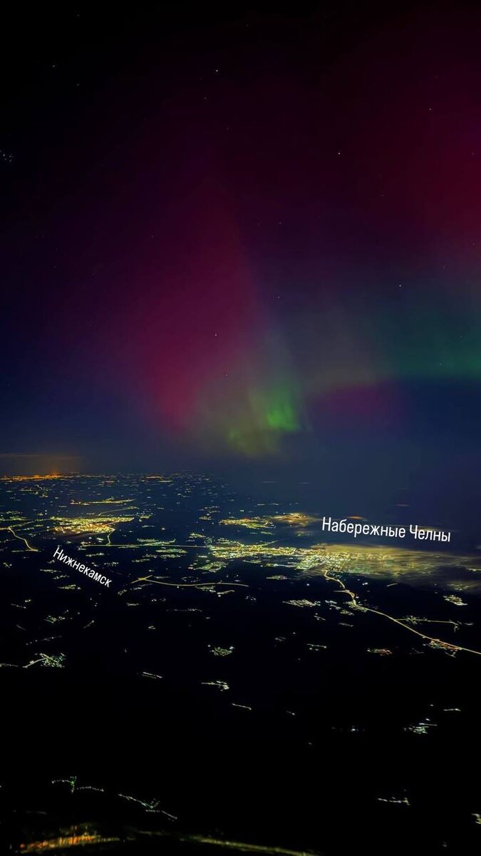 Рейс проходил пару дней назад, когда бушевала магнитная буря, поэтому северное сияние стало таким красочным. Пилот заснял видео взлета из аэропорта в Омске, судя по кадрам ночь была туманной. А вот в небе над Набережными Челнами, Нижнекамском и Казанью можно было ясно увидеть всю красоту природного явления. Фото: KaReNPiLoT