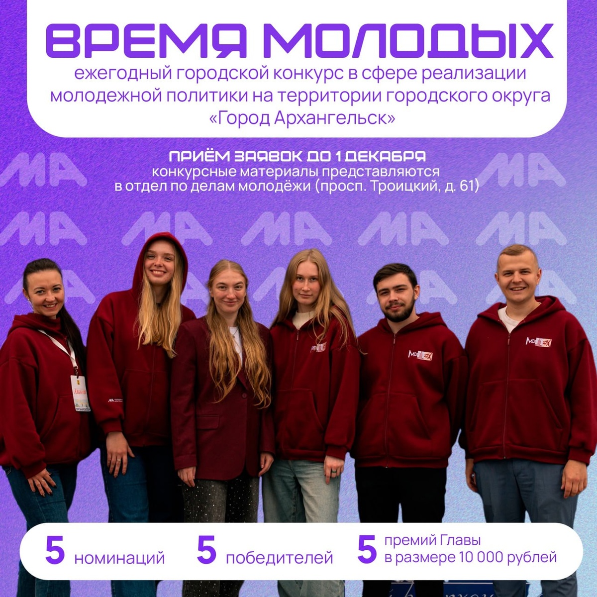 👀 Время видел? Твоё! Молодёжка Архангельска объявила о старте ежегодного городского конкурса в сфере реализации молодёжной политики на территории городского округа «Город Архангельск» — «Время молодых». Пять номинаций — пять победителей : 🎇 «Лидер года» 🎇 «Общественный деятель года» 🎇 «Доброволец года» 🎇 «Патриот года» 🎇 «Творческая личность года» Каждый из них получит денежную премию — 10 000 рублей ⚡️ Если ты активный инициатор социально значимых или патриотических событий, творческая личность, в возрасте от 14 до 35 лет, то скорее собирай документы для участия. Материалы необходимо принести в электронном виде в отдел по делам молодёжи по адресу: ❗️ г. Архангельск, пр. Троицкий, д. 61, с 14 ноября по 1 декабря включительно с 9 до 17 часов в будние дни (обязательно предварительно согласуйте время с Ириной Манойловой) Все подробности здесь: clck.ru/3QJF8V ✨ Конкурс проводится в рамках госпрограммы «Молодежь Поморья» и национального проекта «Молодёжь и дети». #molod29 #нац