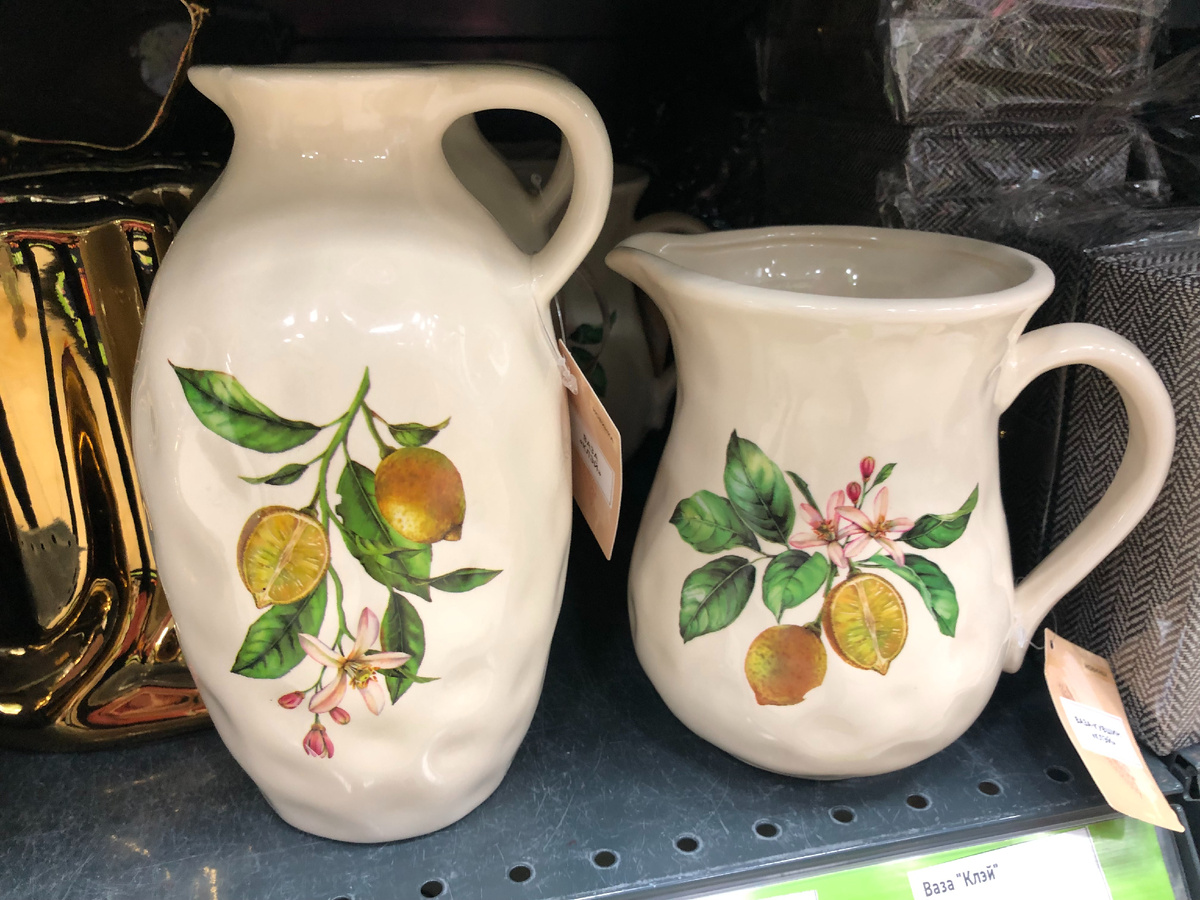 Все еще в наличии есть вазы Клэй. На выбор два варианта по форме. Оба варианта в виде кувшинов в ручками. Выполнены из керамики. Имеют бежевый цвет и декор в ассортименте. Есть лимоны, оливки и подсолнухи. Большая ваза стоит 399 рублей. А та, что поменьше 349 рублей.
