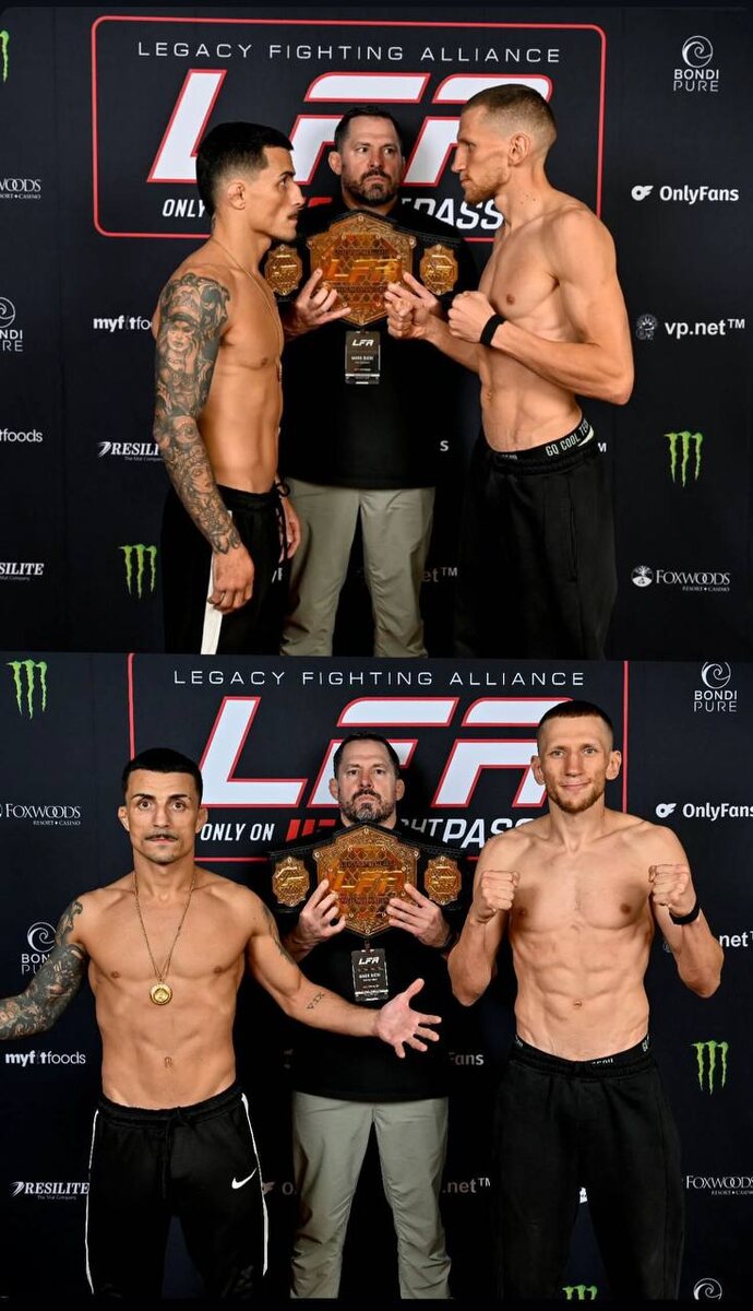 🇷🇺Еще один российский боец может стать чемпионом за сутки до Махачева – болеем за Артема Белаха! 🎖️На кону в поединке с Винисиусом Пиресом пояс LFA в легчайшем весе, сегодня оба участника показали на весах 61,2 кг. 👀Лигу LFA часто называют “пропуском в UFC”, так что возможно Дана Уайт будет внимательно смотреть за этой историей лично. 📅Бой пройдет на турнире LFA 222, который стартует в субботу, 15 ноября в 5 утра по Москве. 📸Фото – телеграм-канал Артема Белаха