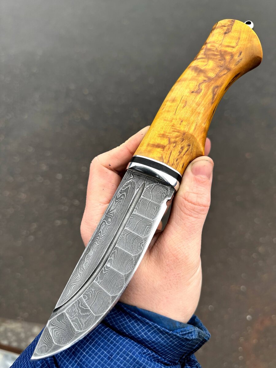 Гепард — нож с мужским характером и душой мастера 🐆 _В основе — дамасская сталь 950 слоёв с фигурными долами и эксклюзивной шлифовкой «под камень»._ Карельская береза желтая рукоять подчёркивает статус и добавляет удобства в хвате. Преимущества: - _Агрессивный рез и отличная пластичность_: идеально для охоты, туризма, рыбалки. - _Держит заточку и легко правится даже в полевых условиях._ - _Формованные долы_ для снижения веса и лучшего баланса. - _Ручная работа 3-го поколения мастеров._ - _Пожизненная гарантия на отсутствие производственных дефектов._ - В комплекте — кожаные ножны. 💎 Характеристики: - Длина клинка: 120 мм - Ширина: 34 мм - Толщина: 3 мм - Длина рукояти: 115 мм - Твёрдость: HRC 62 Цена по акции — 12 104 руб. _Обычная цена — 15 130 руб._ *Опционально: формованные ножны из кожи растительного дубления* (+8000 руб.) 🎁 Подарок для ценителя, верный друг на природе или в коллекции! Пиши для заказа: @Nazarklinokbot или WhatsApp: +79101343831 Подробнее на сайте: [nazarklin