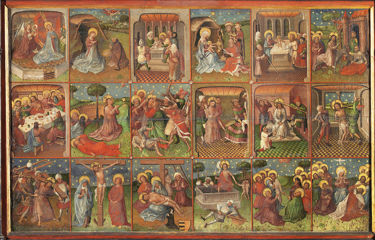 Перед нами моменты из жизни и страданий Иисуса Христа, изображенные как будто в современном комиксе. Он оживлял его историю для большой группы людей, особенно для тех, кто не умел читать. Эффект глубины на этой картине просто потрясающий; пол, кажется, поднимается прямо в небо. Милый ребенок и эмоции на лицах Марии и царей делали историю Христа легкой для понимания верующими. Эта потребность в сочувствии типична для позднего Средневековья. Золотая чаша для вина буквально означает переживания Иисуса в Гефсиманском саду. Он предвидит свою смерть на кресте и просит Бога: «Отче, если возможно, пусть эта чаша минует меня». Римские солдаты одеты в интересные доспехи. На одном мужчине красный наряд с золотыми вставками, на другом — что-то вроде шляпы с отворотами. Маловероятно, что эта одежда была современной. Средневековые художники многое придумывали, когда речь заходила о библейских временах. Изображение природы очень реалистично. Многие виды цветов узнаваемы, например, маргаритка, одуван