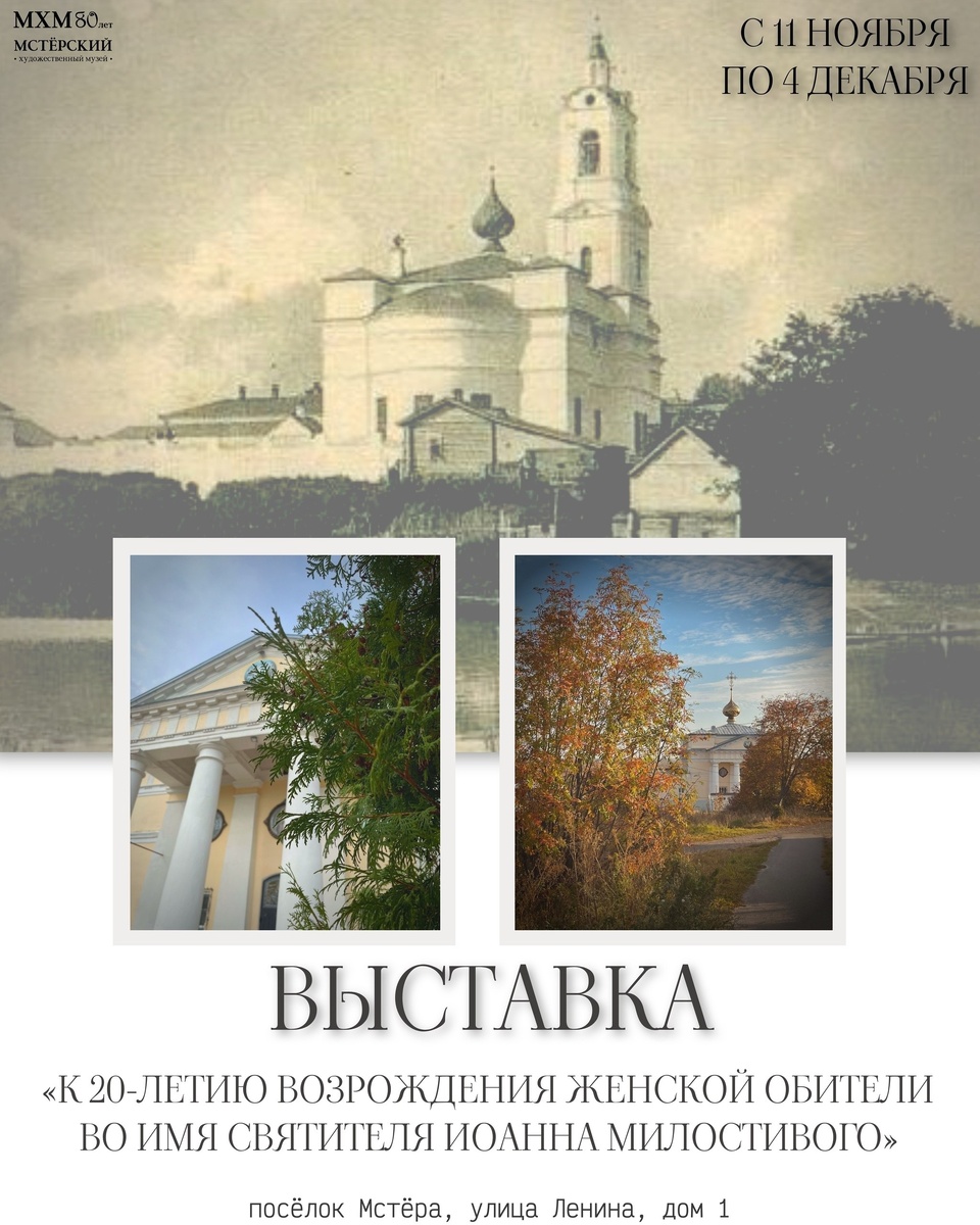 Уважаемые гости и жители Мстёры! Приглашаем вас 14 ноября в 14:30 часов на открытие выставки «История женской обители во имя Иоанна Милостивого», посвященной 20-летию возрождения женской обители Святителя Иоанна Милостивого, которая является символом духовности, единства и православной веры. Вход свободный! Выставочный зал, посёлок Мстёра, улица Ленина, дом 1