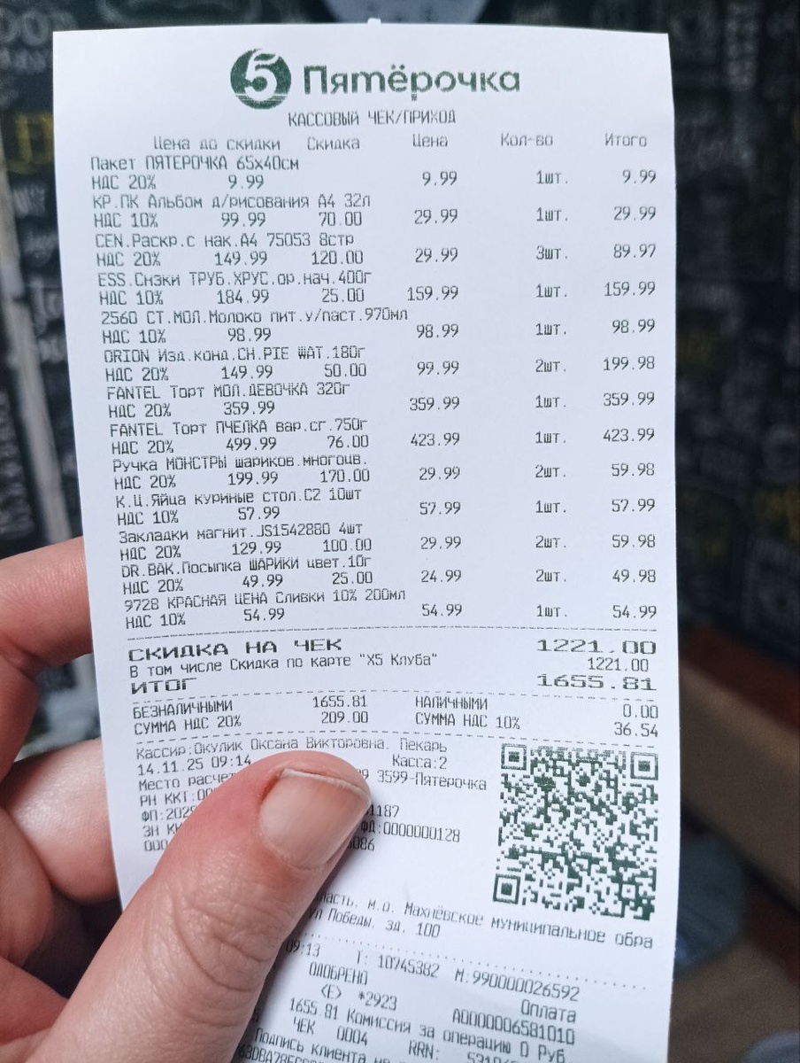 Сегодня день начался рано, сходили с младшим сыном в поликлинику, а потом в Пятёрочку. Там оставили 1600 рублей.