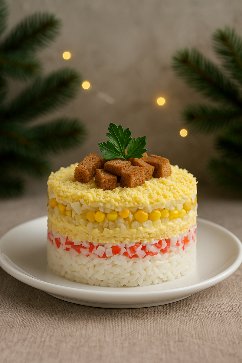 Каждый год я ищу блюда, которые готовятся без лишних хлопот, выглядят празднично и нравятся абсолютно всем. Слоеный салат «Крабы в шубе» — именно такой вариант. Он напоминает привычные «шубные» салаты, но получается легче, нежнее и намного интереснее за счёт сочетания риса, крабовых палочек и хрустящих сухариков.