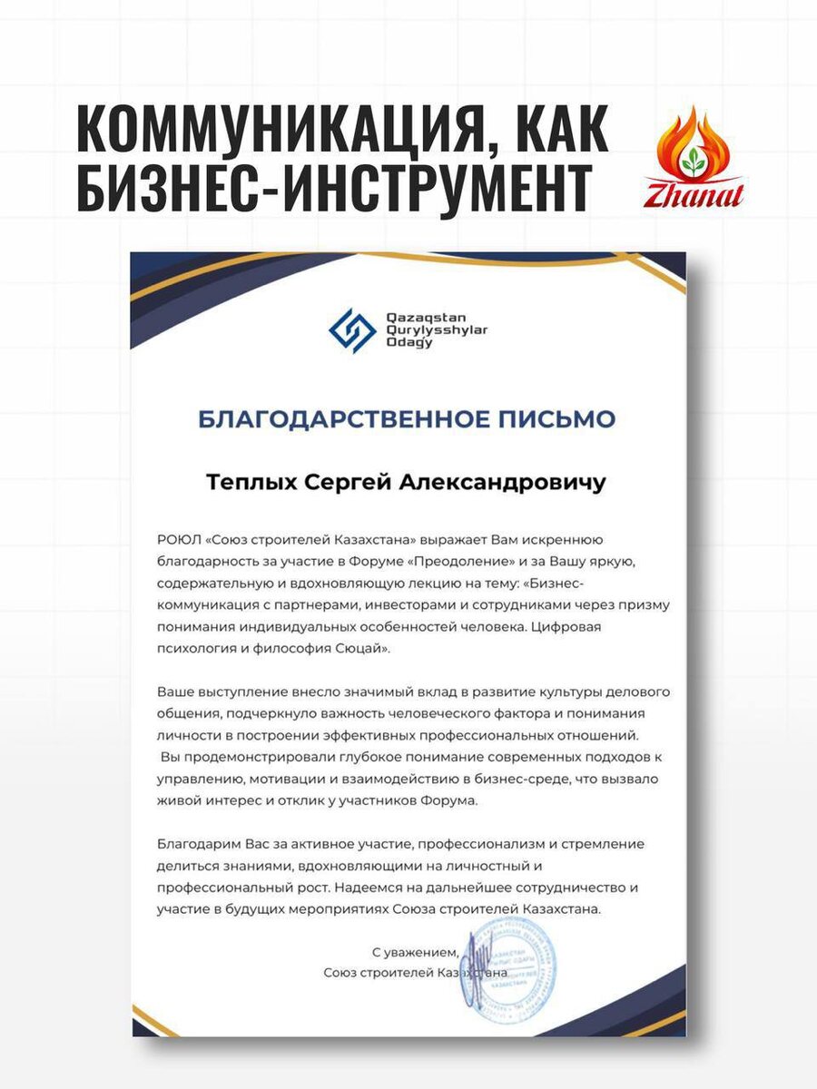 🔥 БИЗНЕС-ФОРУМ ПРЕОДОЛЕНИЕ | Коммуникация как бизнес-инструмент Когда бизнес перестаёт быть просто системой и превращается в искусство договариваться — начинается рост, которого вы ждали. Я получил благодарственное письмо от Союза строителей Казахстана за вклад в развитие культуры делового общения и лекцию на тему: 📌Бизнес-коммуникация с партнёрами, инвесторами и сотрудниками через призму понимания индивидуальных особенностей человека». С этой лекцией я выступил на бизнес-форуме ПРЕОДОЛЕНИЕ 🔥 Благодарю организаторов Форума и Союз строителей Казахстана за оказанное доверие, рад продуктивному сотрудничеству и обмену опытом на высоком уровне! ➡️ https://sskaz.kz/blagodarnostteplyh Мой подход в бизнес-психологии помог сотням предпринимателей выстроить сильные команды, стратегические связи и системные результаты. [Навык коммуникации — это новый капитал. И тот, кто им владеет, всегда будет на шаг впереди.] ⚡️ Если вы — собственник, руководитель или инвестор, который хочет управля