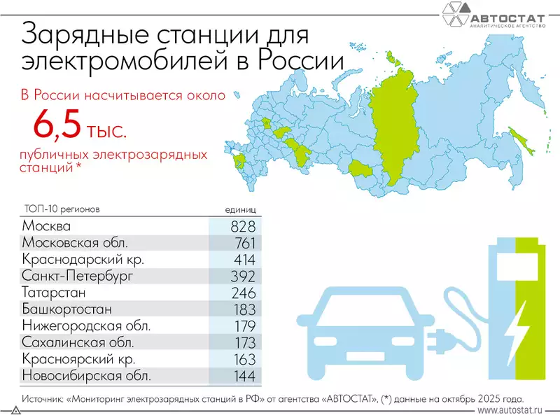 По данным агентства «Автостат», на октябрь 2025 года в России насчитывается около 6,5 тысячи публичных зарядных станций для электромобилей.