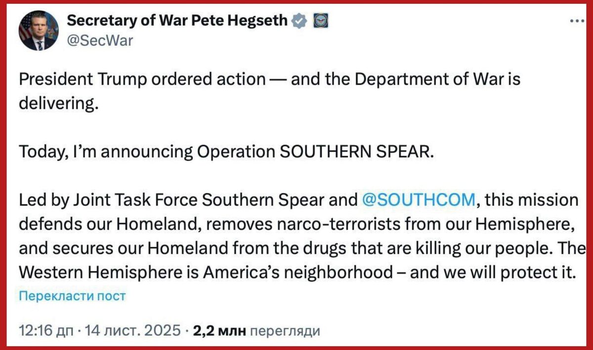 ‼️Трамп заявил о начале военной операции "Южное копьё" в Карибском регионе "Под руководством Объединенной оперативной группы Southern Spear и U.S. Southern Command, эта миссия защищает нашу родину, ликвидирует наркотеррористов в нашем полушарии и обеспечивает безопасность нашей страны от наркотиков, которые убивают наших людей. Западное полушарие — это сосед Америки, и мы будем его защищать." Вот вам и война против Венесуэлы Подпишись на Телеграм Александр Семченко
