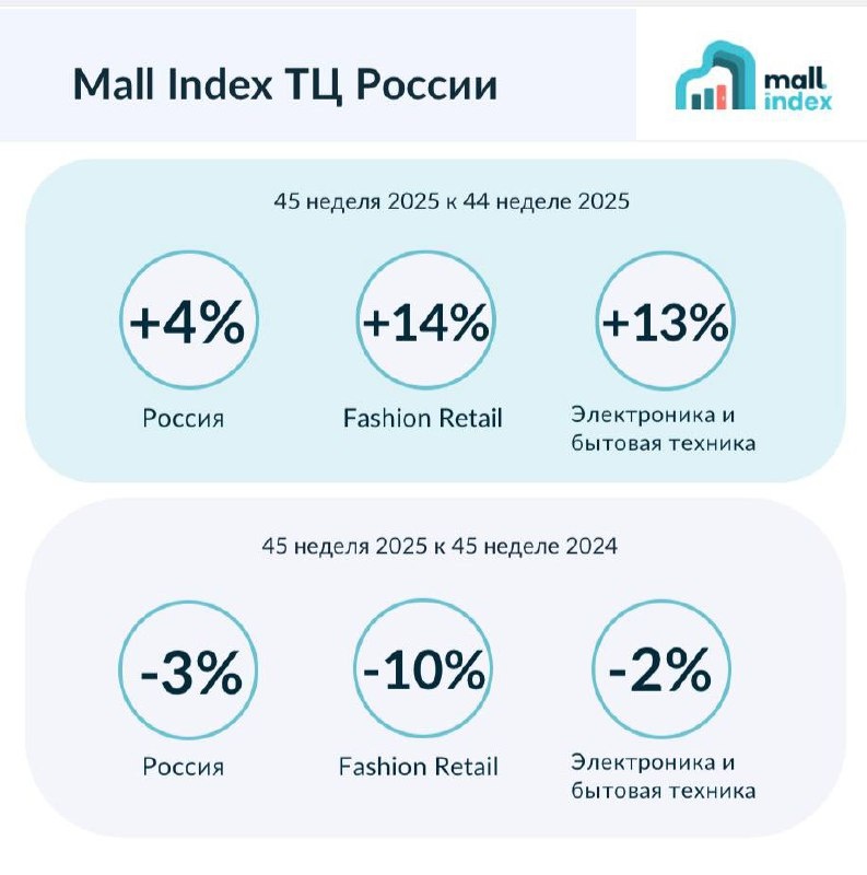 📊 Mall Index ТЦ России Итоги 45 недели 2025 года Праздничная неделя, на которую пришёлся 🎉День народного единства, традиционно показала рост активности в офлайн-сегменте. Аудитория ТЦ: +4% – 45 неделя vs 44 неделя ‘25 −3% – 45 неделя ‘25 vs 45 неделя ‘24 По категориям: 👚Fashion Retail: +14% – 45 неделя vs 44 неделя ‘25 −10% – 45 неделя ‘25 vs 45 неделя ‘24 ⌚️ Электроника и бытовая техника: +13% – 45 неделя vs 44 неделя ‘25 −2% – 45 неделя ‘25 vs 45 неделя ‘24 💬 «По наблюдениям последних лет праздничные недели, на которые приходится день народного единства, обычно характеризуются локальным пиком уровня среднедневных аудиторий торговых центров и как правило ещё более выраженными пиками аудиторий магазинов.» – Михаил Васильев, Focus Technologies 📅 Ключевые периоды офлайн-активности по-прежнему задаются социально-экономическими и традиционными ритмами жизни общества — праздники, сезонность и т.п.