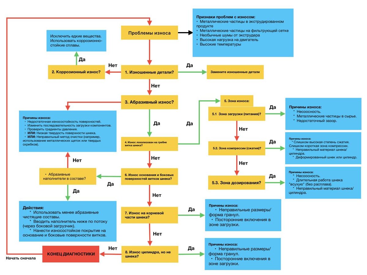Как победить износ экструдера: Диагностика и выбор "брони" для оборудования Мы уже разобрались, что износ оборудования — это следствие абразивной, коррозионной или механической атаки. Теперь поговорим о решениях: как правильно лечить проблему, а не просто маскировать симптомы. 1. Точная диагностика: Лечим причину, а не следствие Ключ к успеху — определить причину и механизм износа. • Пример: Если изношен только внешний диаметр витка шнека, но не его боковые поверхности, это явный признак контакта "металл по металлу" (шнек-цилиндр). • Неправильное решение: Просто нанести твердосплавное покрытие на виток. Это временно замедлит износ, но не устранит причину. • Правильное решение: Изменить конструкцию шнека или скорректировать профиль давления (например, перейти на "голодное" питание), чтобы устранить боковой дисбаланс сил. 2. Борьба с коррозией: Химия против металла Если вы определили, что проблема в коррозии (по характерным "изъеденным" поверхностям): • Идеальный вариант: Устран
