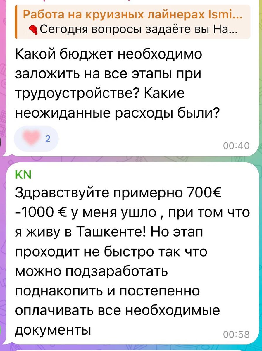 💰 Вложения при трудоустройстве на лайнер Расходы до выхода на борт — это не плата за работу, а подготовительный этап, который вы проходите ДО вылета. Наши услуги: Консультация, подбор вакансии, проверка документов, организация собеседования, инструкции по визе и бумагам — всё бесплатно. Когда понадобятся деньги: Большая часть расходов появится уже после успешного собеседования и подтверждения от работодателя. На весь процесс оформления обычно уходит от 3 до 9 месяцев, а платежи распределяются постепенно. 💵 Примерные затраты: 🔹 Консульские и визовые сборы — $90–300 (зависят от страны и посольства) 🔹 Медицинская комиссия — $150–300 (проходится в аккредитованных центрах по требованиям круизной компании) 🔹 Сертификаты по безопасности — $150–500 (оформляются в специализированных учебных центрах) 🔹 Паспорт моряка — $50–200 (оформляется в портовых городах) ✈️ Авиабилет — оплачивает работодатель (исключение — некоторые компании, например, Marella Cruises) От чего зависит итоговая с