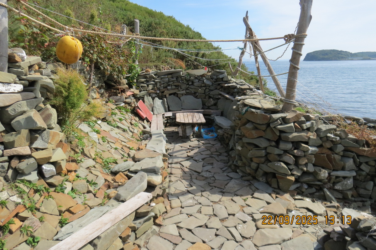 Дачный домик разделен на 2 помещения Это .с левой стороны,учитывая наличие очага и мангала по видимому кухня.или по морскому камбуз Полностью защищена стеной от южного ветра с бухты Сади напомню достаточно высокая скала ,поэтому ветра там тоже нет