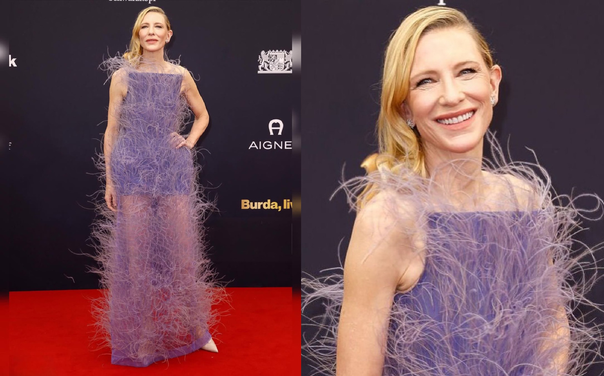 В Мюнхене вновь расстелили красную дорожку премии Bambi Awards. Среди гостей было много громких имён, но именно выход Кейт Бланшетт заставил прессу вспоминать ранние авангардные показы и обсуждать моду как искусство. Актриса появилась в платье Stella McCartney, созданном из инновационного растительного материала, который имитирует перья. Фигура словно растворялась в облаке тончайших лиловых нитей и выглядела как часть живой инсталляции. Этот наряд был разработан в сотрудничестве со стартапом Fevvers. И европейские СМИ сразу отметили экологическое направление образа. Тема устойчивой моды встроена в саму ткань платья. Лёгкие лиловые волокна создают эффект движения даже тогда, когда Кейт стоит на месте. Фактура притягивает внимание. Она играет на свету и создаёт ощущение нежного тумана вокруг актрисы. Но есть важный момент. При всей визуальной смелости этот эксперимент не усилил природную красоту Бланшетт. Это не тот случай, когда платье подчёркивает черты лица или делает фигуру выразите