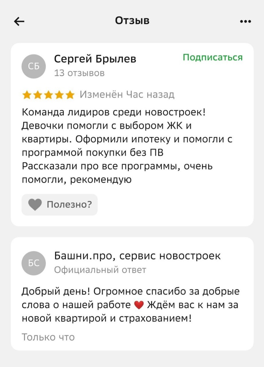 ❤️ ОТЗЫВЫ О БАШНИ.ПРО ❤️ Друзья, благодарим каждого, кто выбирает нашу компанию. Мы не агентство одной сделки. Для нас действительно важно не просто сопроводить сделку, а поддерживать наших клиентов на протяжении лет 20 минимум, пока есть ипотека. Что мы делаем: ✅ Подбор недвижимости в новостройках ✅ Обмен вашего жилья на новостройку ✅ Все ипотечные программы, в том числе без первоначального взноса ✅ Страхование по ипотеке ✅ ОСАГО Мы постоянно улучшаем наш ИТ продукт. У нас проходят практику студенты по it разработке и маркетингу. Помогаем организовывать мероприятия для предпринимателей и внедряем CRM, чтобы помочь развивать бизнес. Поддерживаем семьи и дарим подарочные сертификаты. 🖥 Кстати, совсем скоро, 30 ноября в Нагорном парке пройдёт фестиваль "Счастливая мама". Приглашаем отдохнуть и весело провести время с семьёй! 📱 Пишите WA 🔸 Звоните +74232800207 🔸 Отдел продаж: ул. Жигура, 26а, офис 5-9 ❤️ Ваш сервис новостроек №1 Башни.про