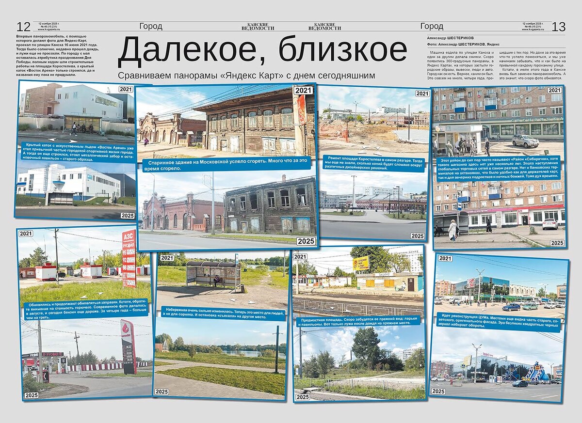 Впервые панорамомобиль, с помощью которого делают фото для Яндекс-Карт, проехал по улицам Канска 16 июня 2021 года. Тогда было солнечно, недавно прошел дождь, и лужи еще не просохли. По городу с мая оставалась атрибутика празднования Дня Победы, полным ходом шли строительные работы на площади Коростелева, а крытый каток «Восток Арена» только строился, да и названия ему пока не придумали. Машина ездила по улицам Канска и один за другим делала снимки. Скоро появились 360-градусные панорамы, в Яндекс Картах, на которых застыли городские образы, вывески, люди и авто. Город как он есть. Вернее, каким он был. Это совсем не много, четыре года, прошедшие с тех пор. Но даже за это время что-то успело поменяться, и мы уже начинаем забывать, что и как было на привычной каждому горожанину улице. Кстати, в июле этого года в Канске вновь был замечен панорамомобиль. А это значит, что скоро фото обновятся. Крытый каток с искусственным льдом «Восток Арена» уже стал привычной частью городской спортивной