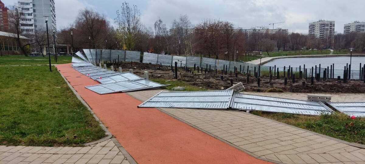 Из-за сильного ветра упал забор. Пруд Гольяново.