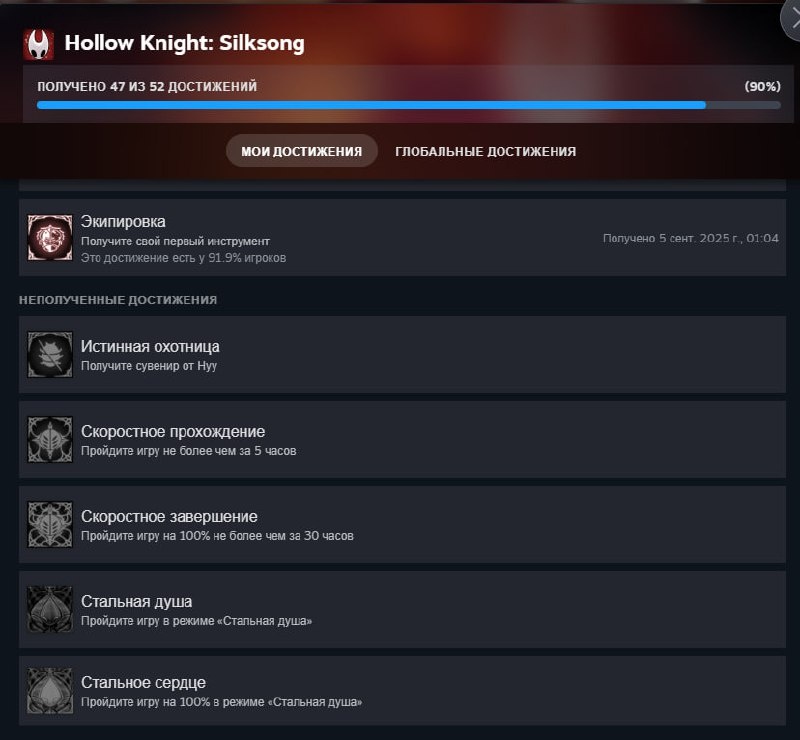 А еще, кто прошел Silksong, делитесь своими ачивками, я знаю у вас есть чем похвастаться! Вот мои ☺️