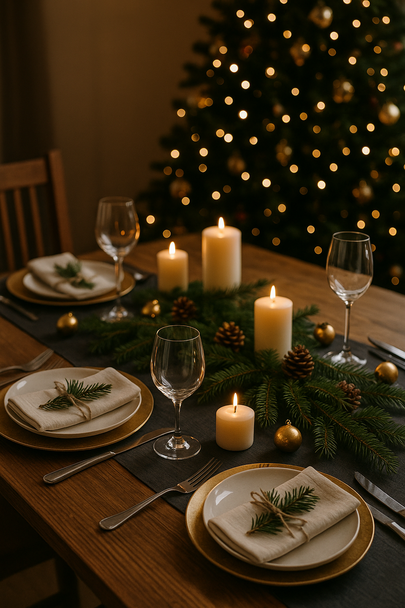 - Еловая дорожка: расстелите еловые ветки по центру стола, добавьте шишки и 3–5 свечей.