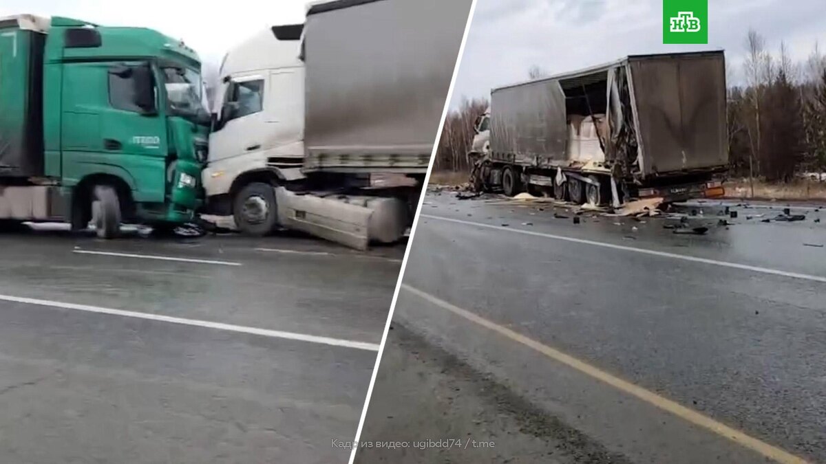 [ Смотреть видео на сайте НТВ ] В Сети появилось видео с последствиями массового ДТП с участием 6 грузовиков. Столкновения фур на скользкой дороге произошли на 1774-м км М-5 «Урал» между Златоустом и Миассом. На кадрах видны разбитые тяжеловозы после лобового столкновения, у одного из них разрушен прицеп. Обошлось без пострадавших. Незадолго до аварии шел дождь, затем температура воздуха понизилась, образовался гололед. Движение на двухполосном участке после аварии дороги перекрыто. [ Смотреть видео на сайте НТВ ]