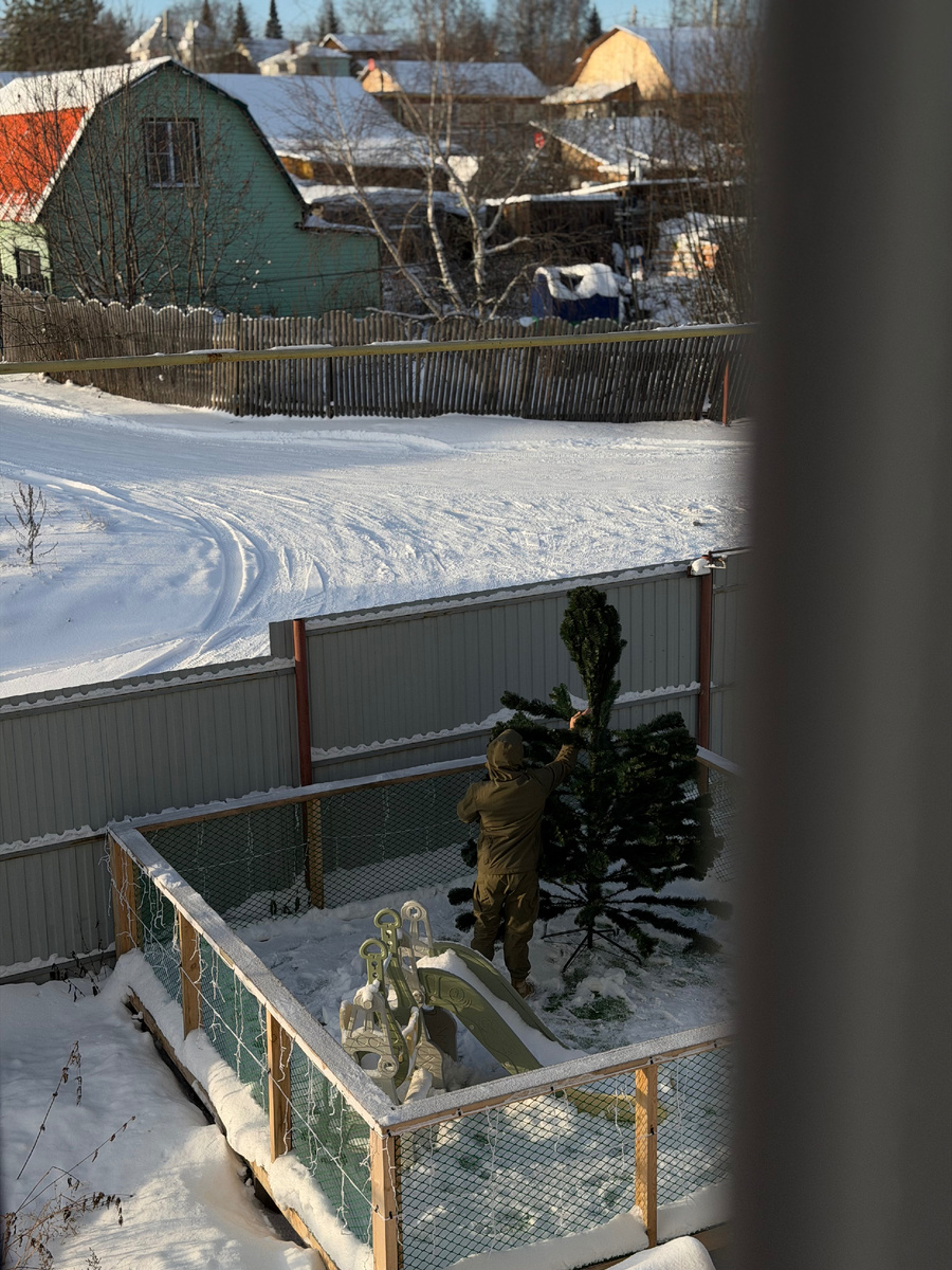 Всем здравствуйте! Делаем новый заход, смотрим…Ожил ли Дзен. Если опять отсчёт вовлечённого времени появился, возможно, техработы закончены. Вообще, я надеюсь, что за эту неделю, когда всё и везде отключили, Дзен переходил на свои собственные независимые от Яндекса алгоритмы и через два года ему будет всё равно, что аренду с ним не продлили. Ну надо же хоть что-то хорошее по всём этом деле разглядеть😁! Посмотрим… А нашего ДиЛеХтора сегодня Золушка покусала, пропылесосил всё, даже зеркало на стене 😅! Да и нас с папенькой стороной не обошла, мы вещи, перестиранные за неделю, разбирали и разносили по местам с утра пораньше. Потом суп сварили. Сейчас он (не суп, если чО) собирается в лес ехать, проводим и пойдём работать с Платошкой. А вчера мы устанавливали во дворе ёлку. Получилось классно. Мне нравится даже сейчас в незаконченном виде. Ёлка 3-метровая, плюс подставка, то есть фактически даже выше. Тяжёлая. Чтобы не сносило ветром, папа Леший прикрутил её к площадке. Стоит надёжно.