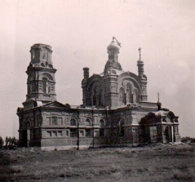 Фотография, примерно июль 1942 года, Сальский район, село Сандата, Ростовская область, церковь Георгия Победоносца во время фашистской оккупации. Располагается по адресу Ростовская область, Сальский район, село Сандата, ул. Матросова, дом 1. В сражении наши пограничники потеряли убитыми около 300 человек, в их числе была санинструктор Ольга Кирилловна Линдрик, которая погибла, вынося с поля боя раненых. Было ей всего 20 лет. Немалые потери понесли и другие подразделения. В тех жестоких кровавых боях погибли и семь жителей села Сандата. Это жители села Сандата - Иванович Миргород, Иван Михайлович Галий, Владимир Фомич Лунев, села Березовка - Демьян Сергеевич Ольховский, Дмитрий Порфентьевич Сагарь, села Новый Егорлык - Иван Тихонович Божинский и Яков Павлович Божинский. Их имена увековечены на памятных плитах мемориала. На месте гибели пограничников установлен величественный мемориал «Они стояли насмерть». Фото 2