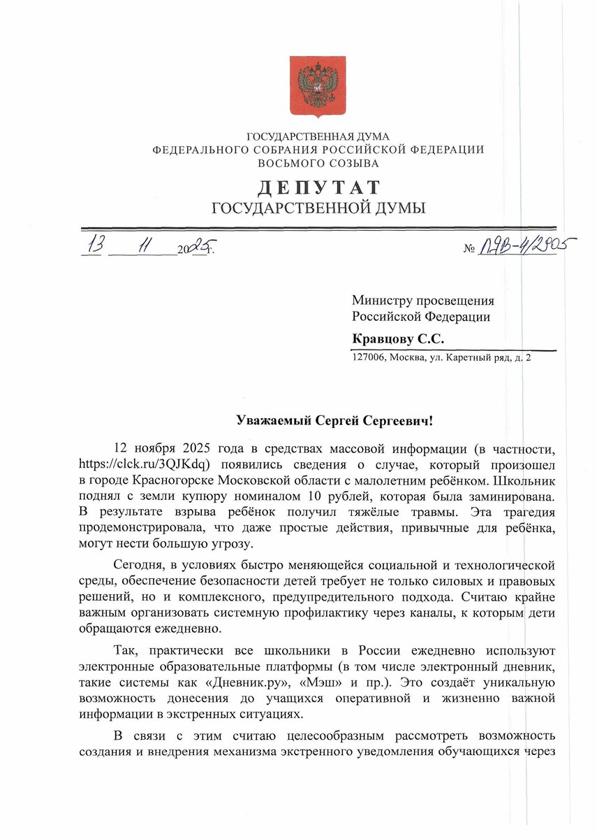 Безопасность детей через электронный дневник и комиксы В Красногорске 9-летний ребенок пострадал при взрыве у детской площадки. Мальчику оторвало пальцы, когда он пытался поднять деньги с земли. Купюра оказалась заминирована. ❌Сегодня даже привычные действия могут нести серьезную угрозу. Обратилась к министру просвещения Сергею Кравцову с инициативой. Предлагаю создать систему экстренного оповещения через пуш-уведомления в электронных дневниках. Ими ежедневно пользуются практически все школьники России. Сообщения должны поступать от МВД и МЧС в сдержанном, доступном и выверенном формате. Без нагнетания, с акцентом на безопасность. Кроме того, необходимо регулярно размещать в электронных дневниках профилактические материалы. 📊Например, комиксы. А также инфографику и примеры из реальной жизни. Существуют НКО, которые создают комиксы с описанием опасностей. Рассказывают, как на них реагировать, как выходить из сложных ситуаций. Это делается не для того, чтобы напугать детей. А чтобы