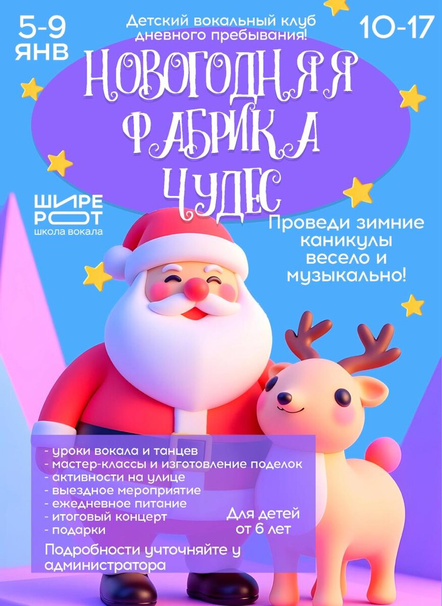 С 5 по 9 ЯНВАРЯ ВОКАЛЬНЫЙ ДЕТСКИЙ КЛУБ ДНЕВНОГО ПРЕБЫВАНИЯ! еждневно с 10:00 до 17:00💜 Подарите детям яркие каникулы!🎄 5 насыщенных музыкальных дней под присмотром любящей команды школы "ШИРЕРОТ" с активностями, уроками вокала и танцев, питанием, играми, отчетным концертом и подарками! Подробную программу можно прочитать на нашем сайте: ПРОГРАММА КЛУБА Всего 10 мест! При внесении предоплаты/полной оплате клуба до 15.12 скидка! Чтобы записаться, пишите нашему админу @shirerot ! Ждем с нетерпением в нашу "Новогоднюю фабрику чудес!"