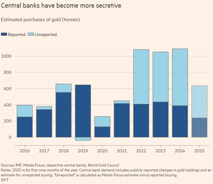 Центральные банки стали более скрытными. Предполагаемые закупки золота (тонны). Разглашено / не разглашено. Источники: МВФ, Metals Focus, соответствующие центральные банки, Всемирный совет по золоту. Примечания: 2025 год указан за первые девять месяцев года. Спрос центральных банков включает публично опубликованные изменения в запасах золота и оценку незарегистрированных покупок. «Незарегистрированные» покупки рассчитываются как оценка Metals Focus за вычетом зарегистрированных покупок.©FT