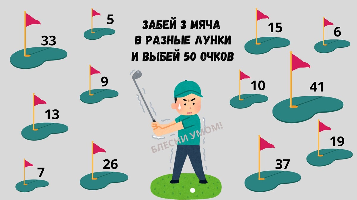 Игры с числами часто напоминают спортивные состязания: нужно не просто попасть в цель, а сделать это максимально точно. Представьте себе поле с множеством лунок, каждая из которых имеет свой номер — и именно этот номер превращается в количество очков. Задача звучит просто, но на деле требует хитрости: нужно набрать ровно 50 очков, бросив всего три мяча в разные лунки. Казалось бы, вариантов много, но не все приведут к победе. Эта головоломка проверяет вашу способность мыслить стратегически, искать нестандартные решения и удерживать в голове сразу несколько числовых сценариев. Попробуйте сами найти правильные лунки — ведь именно момент «эврики» делает такие задачи захватывающими. Нашли правильные лунки и выбили свои 50 очков? 🏆 Напишите в комментариях, какие комбинации у вас получились! 💬 Ставьте лайк 👍 и подписывайтесь, чтобы не пропустить новые головоломки и интересные задачи. 🚀 По этой ссылке ты найдешь много увлекательных головоломок
