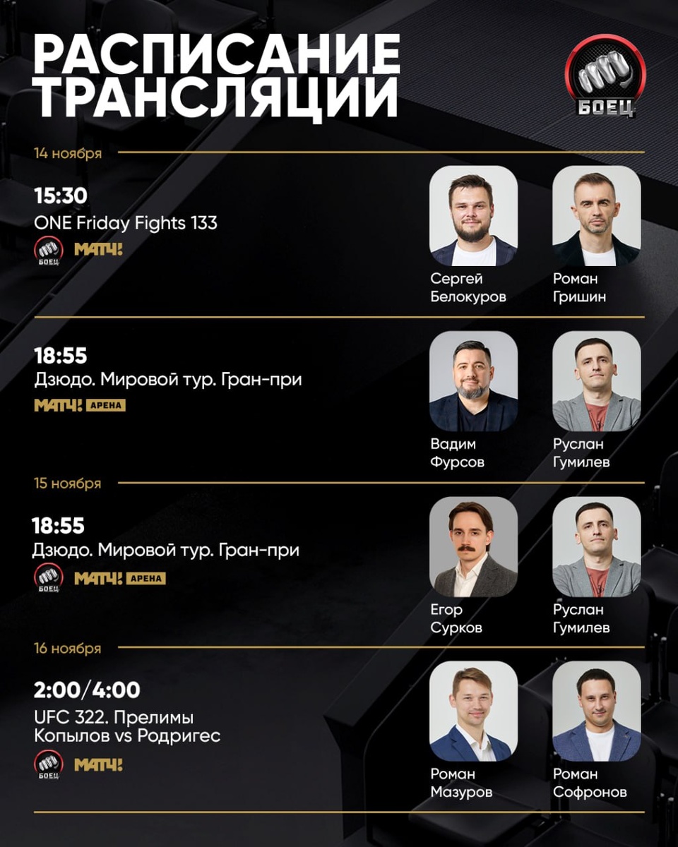 Насыщенные выходные с Матч!Боец 📺🔥 Ожидается очень интересная программа. Знакомим вас с ней 🤝 Традиционный турнир ONE Friday Fights, дзюдо, большой UFC 322, Bare Knuckle FC 84 и еще один большой турнир ONE 173 👀 Заскакивай на сайт и выбирай трансляцию для себя ✅