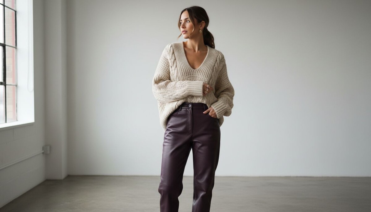 - Сочетайте баклажановые кожаные брюки с объемным кашемировым свитером молочного или угольно-серого цвета. Это создает идеальный контраст между глянцевой фактурой низа и мягкостью верха.