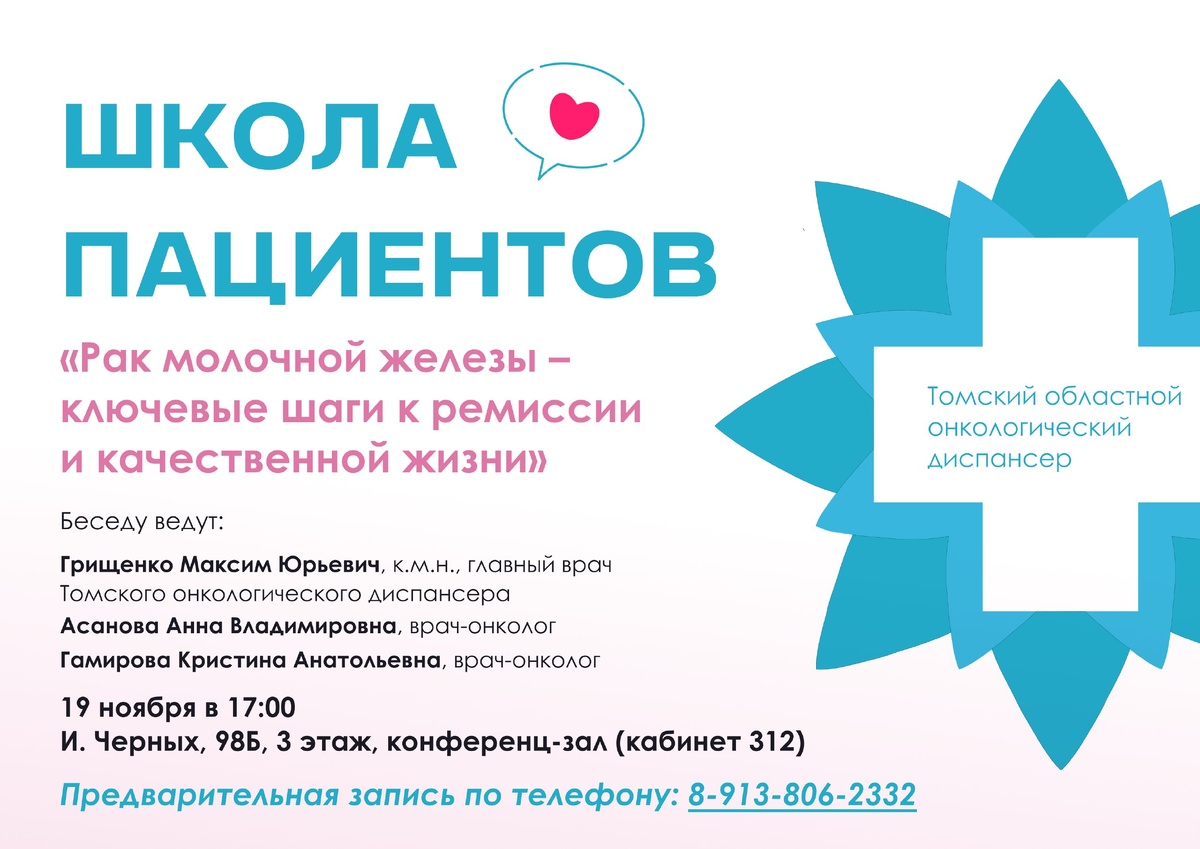 Дорогие друзья! Приглашаем вас присоединиться к новой Школе пациентов, посвящённой теме «Рак молочной железы – ключевые шаги к ремиссии и качественной жизни». Спикерами мероприятия выступят: — Асанова Анна Владимировна, врач-онколог Томского онкологического диспансера, — Гамирова Кристина Анатольевна, врач-онколог Томского онкологического диспансера Мероприятие состоится 19 ноября (среда) в 17:00 на базе Хирургического корпуса Томского онкологического диспансера по адресу: ул. Ивана Черных, 98Б, 3 этаж, конференц-зал, кабинет 312. Для участия необходимо предварительно записаться по номеру: 8-913-806-23-32.