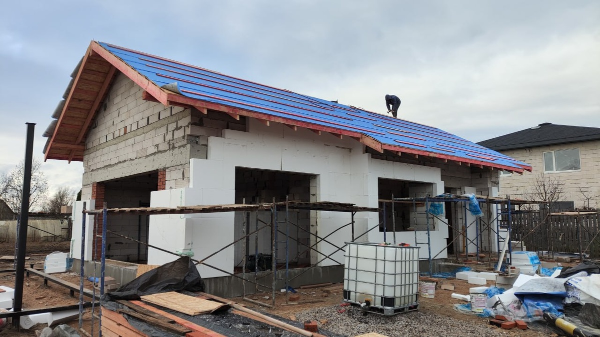 Наш одноэтажный дом растёт и крепнет! Стены уверенно держат форму, бетонные перемычки и армапояс придают конструкции надёжность, фронтоны из газобетонных блоков на месте, а стропильная система уже готова принять на себя тяжесть крыши. И вот — начинается мягкой кровли: скоро дом обретёт свой завершённый облик и будет готов встречать новых хозяев! Короткое видео можно посмотреть по ссылке: https://youtube.com/shorts/8gi6_Gub29g?feature=share https://vk.com/clip-36823628_456239145