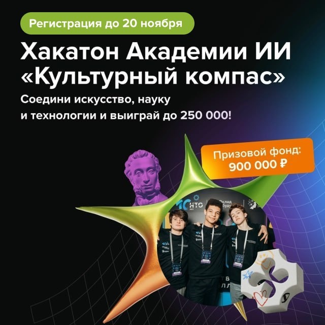 Регистрация на Всероссийский хакатон Академии ИИ «Культурный компас» продолжается! Академия ИИ приглашает школьников и студентов от 14 до 18 лет принять участие в решении задачи государственного масштаба — сделать цифровое наследие Пушкинского музея доступнее для всех. Участникам предстоит создать умную систему рекомендаций, которая поможет пользователям легко находить интересные материалы: видеоэкскурсии, лекции, статьи и аудиогиды. Лучшие решения будут интегрированы в цифровую экосистему Пушкинского музея, а их авторы смогут использовать этот проект в своем портфолио, а также получат льготы на олимпиадах и приглашения в профессиональное сообщество экспертов. Формат: онлайн Подробная информация и регистрация: hackrus.ru/1070 #хакатон #hackathon #hackathonsrus #хакатонырус хакатоны.рус — открой с нами мир хакатонов