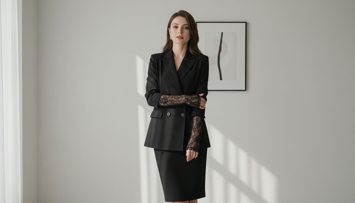 Ключ к успеху этого тренда-противопоставление. Представьте себе тяжелый, будто с мужского плеча, жакет с гипертрофированными плечами. Он олицетворяет силу и строгость. И тут из-под его манжет или воротника выглядывает тончайшее, почти невидимое кружево. Это создает эффект «сильной женщины, которая не боится быть нежной». Это не просто красиво, это интеллектуально, потому что вы играете с архетипами.