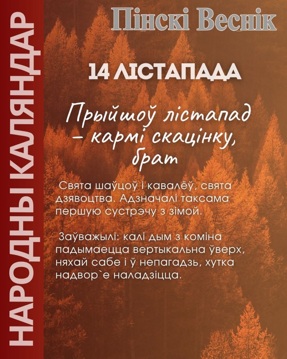 14 лістапада 🔸Свята шаўцоў і кавалёў, свята дзявоцтва. Адзначалі таксама першую сустрэчу з зімой. 🔸Заўважылі: калі дым з коміна падымаецца вертыкальна ўверх, няхай сабе і ў непагадзь, хутка надвор`е наладзіцца. @Пинский Вестник ЮТУБ | САЙТ| ИНСТ | ВК | ОК | ФЕ | Прислать новость