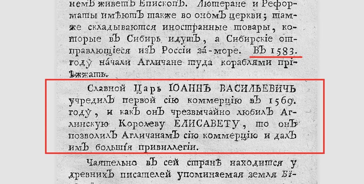 царь будто бы учредил первую коммерцию в 1569 году и настолько нежно относился к английской королеве Елизавете, что позволил её подданным практически всё.