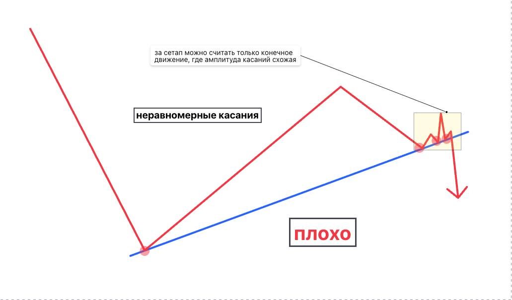 Ребят, сразу говорю, сохраняйте пост — эта ошибка встречается у 90% трейдеров. Делюсь инфой, которую вы не найдете в открытых источниках. Один из четырёх критериев построения уровня — касания линии. Важно не просто количество касаний, а равномерность. Если между первым и вторым касанием у вас огромная амплитуда, а потом график делает частые мелкие касания (как на первой картинке) — это ❌ плохо. Такой уровень видит мало участников рынка, потому что цена ушла далеко от первой точки и вернулась через длительное время. Ликвидности за таким уровнем — минимум. Хороший уровень, когда касания волнообразные, с плюс-минус одинаковой амплитудой и расстоянием между ними. Тогда уровень очевиден, его видит большинство участников, и стопы за ним собраны. 📈 В таких случаях пробой или отскок происходят чисто и технично. Трейдинг — это не про случай. Это про систему, где каждая мелочь влияет на результат. Кстати, мы запустили новое направление в рамках экосистемы INV, где каждый день делимся