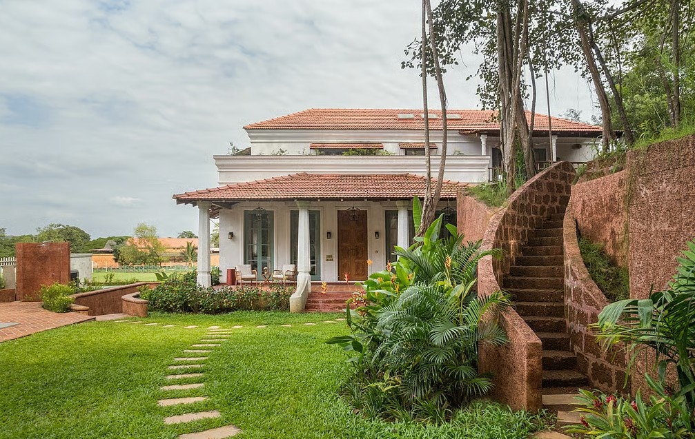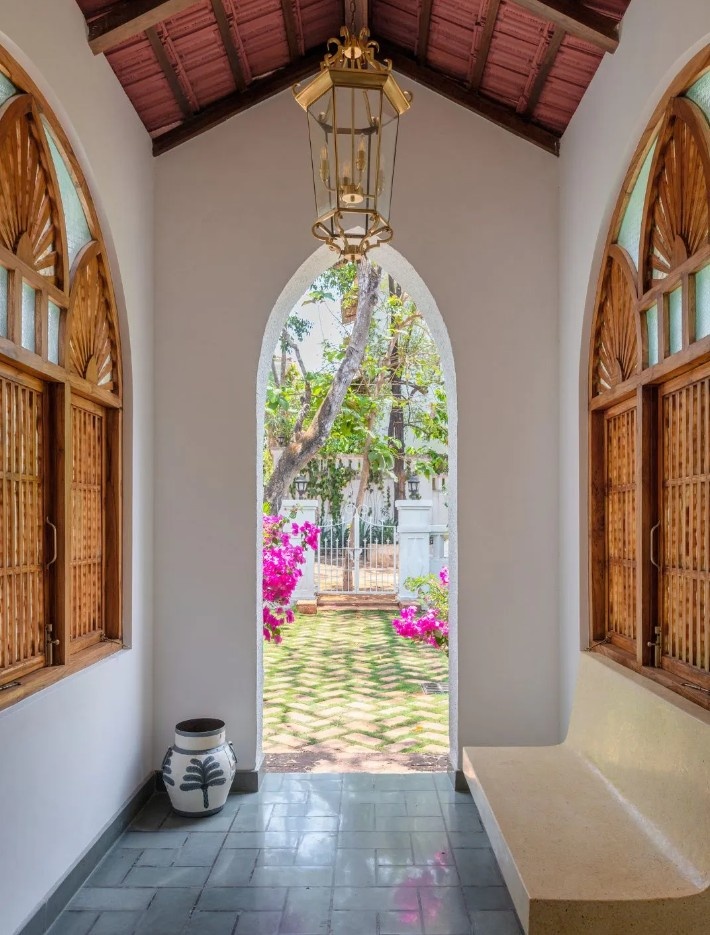 Архитектура Гоа всегда была про гармонию: между воздухом и светом, домом и улицей, временем и памятью. «Мы хотели, чтобы дом выглядел подлинно гоанским, уходящим корнями в местный образ жизни, но адаптированным к современным потребностям», — объясняет Варун. Фасад виллы площадью 4000 квадратных футов с зубчатыми арками, красной черепичной крышей и окнами в форме цветков заимствован из старых индо-португальских домов, но пропорции и детали кажутся более легкими и плавными.